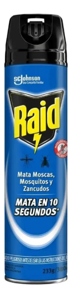 El insecticida Raid Aerosol 370cc (Max o regular) es un spray potente diseñado para eliminar mosquitos (incluyendo los que transmiten Dengue, Zika y Chikungunya), zancudos y moscas al instante. Su fórmula de acción rápida actúa por contacto o mediante la niebla en el aire, ofreciendo en sus versiones Max hasta 10 horas de protección prolongada.